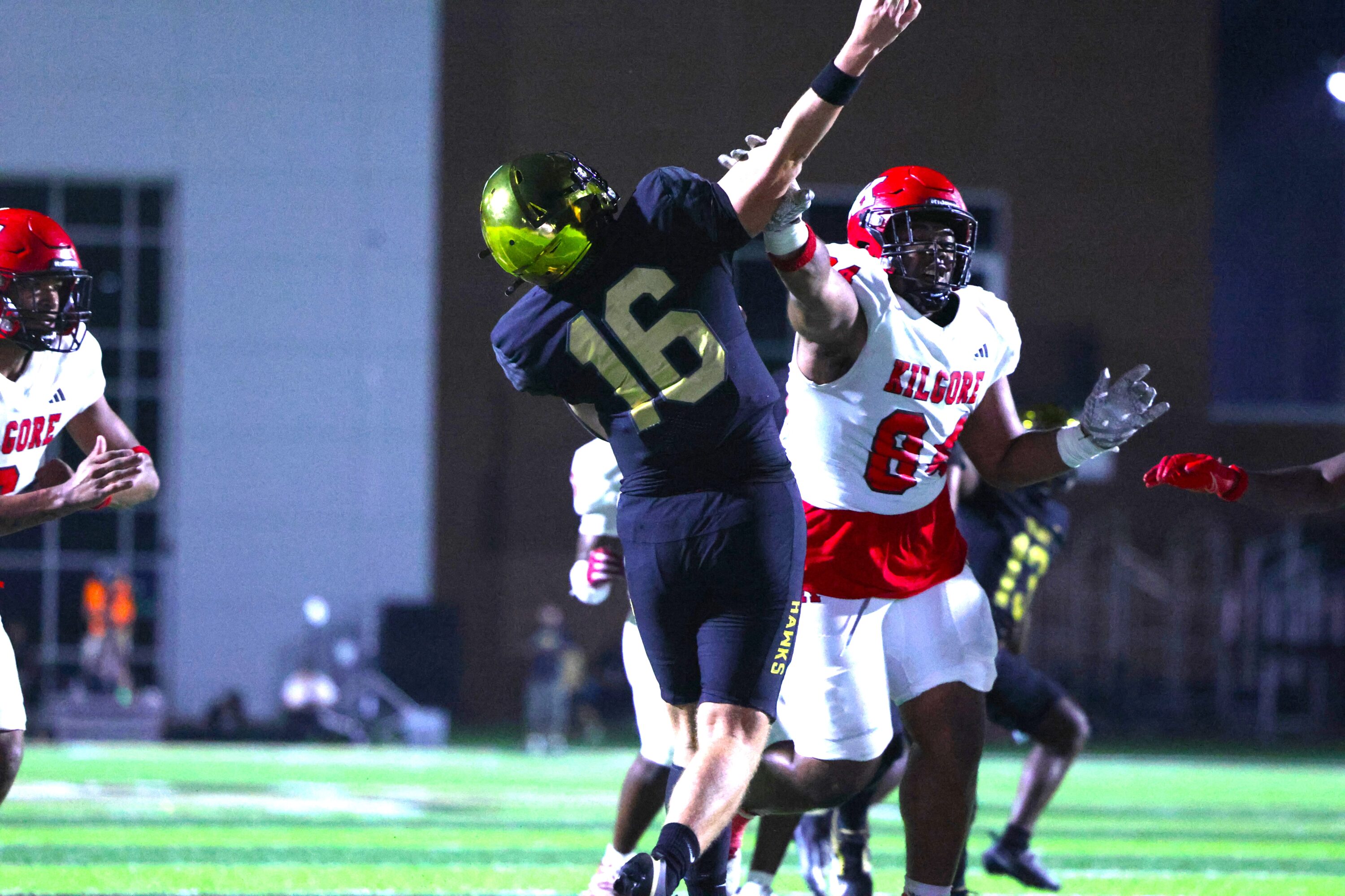 Neither team scored in the third period, but Kilgore tripled Pleasant Grove’s number of plays, 16 to five. The Hawks started fast, though, from their 18-yard line with 7:48 to go in the quarter on a 56-yard run by Nick Bells. Brayden Williams made the saving tackle at the Kilgore 26. Tyler Johnigan, Graves and Isaiah Watters made key defensive plays, forcing the drive to stall. On fourth-and-9 from the Kilgore 26, Yancey threw into the end zone, but the pass was knocked away by Brayden Williams.