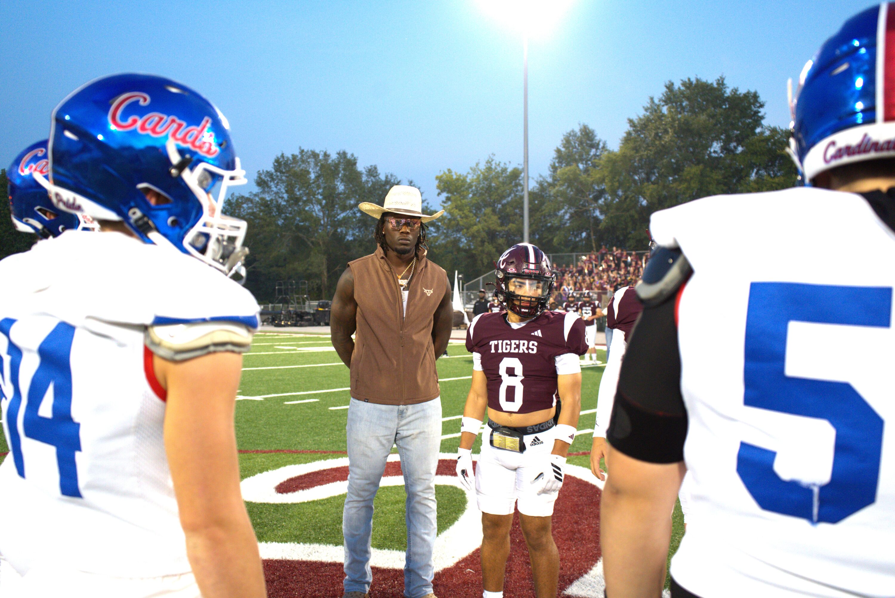 And it really WAS a homecoming for many, including Arp alumnus DeMarvion Overshown, who was not just in attendance for the game – he participated in the coin toss, and also brought a gift: a $5,000 check to the city to help fund a splash pad for its children.