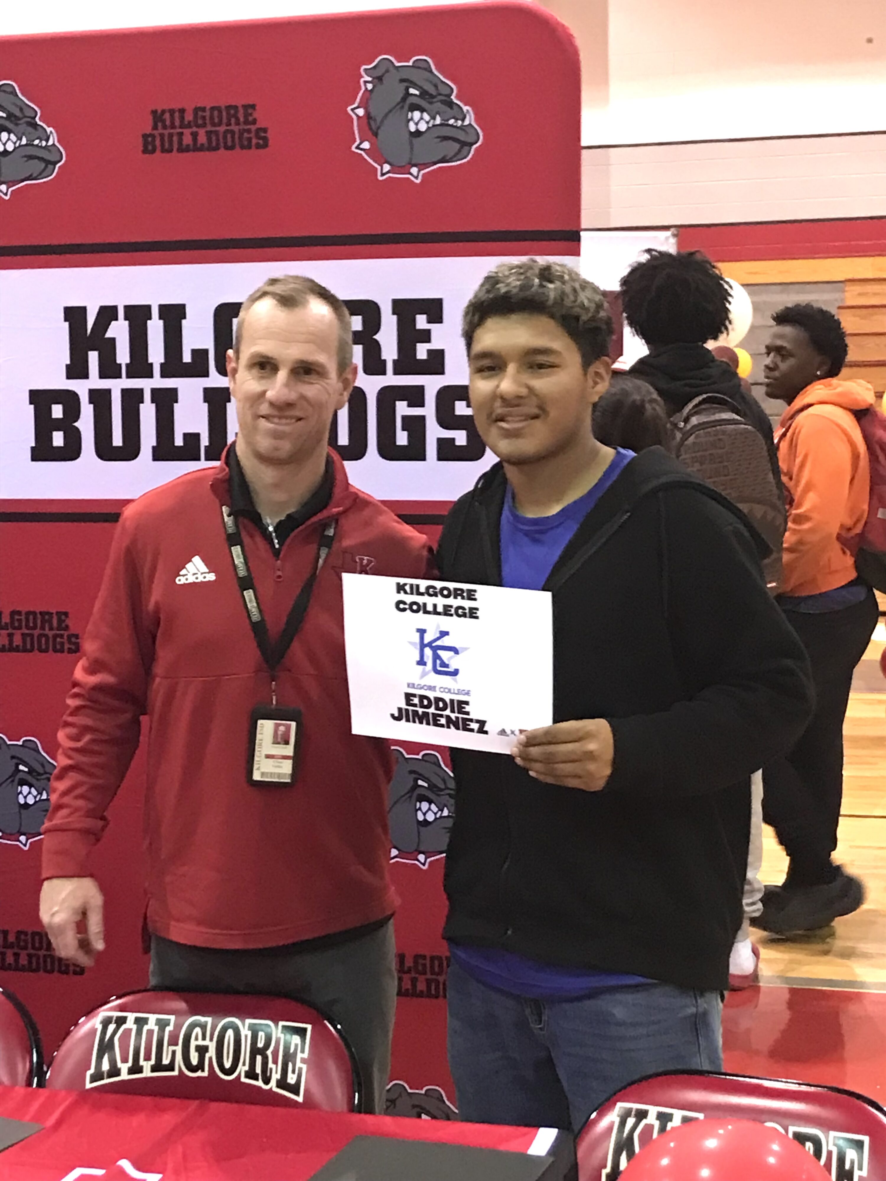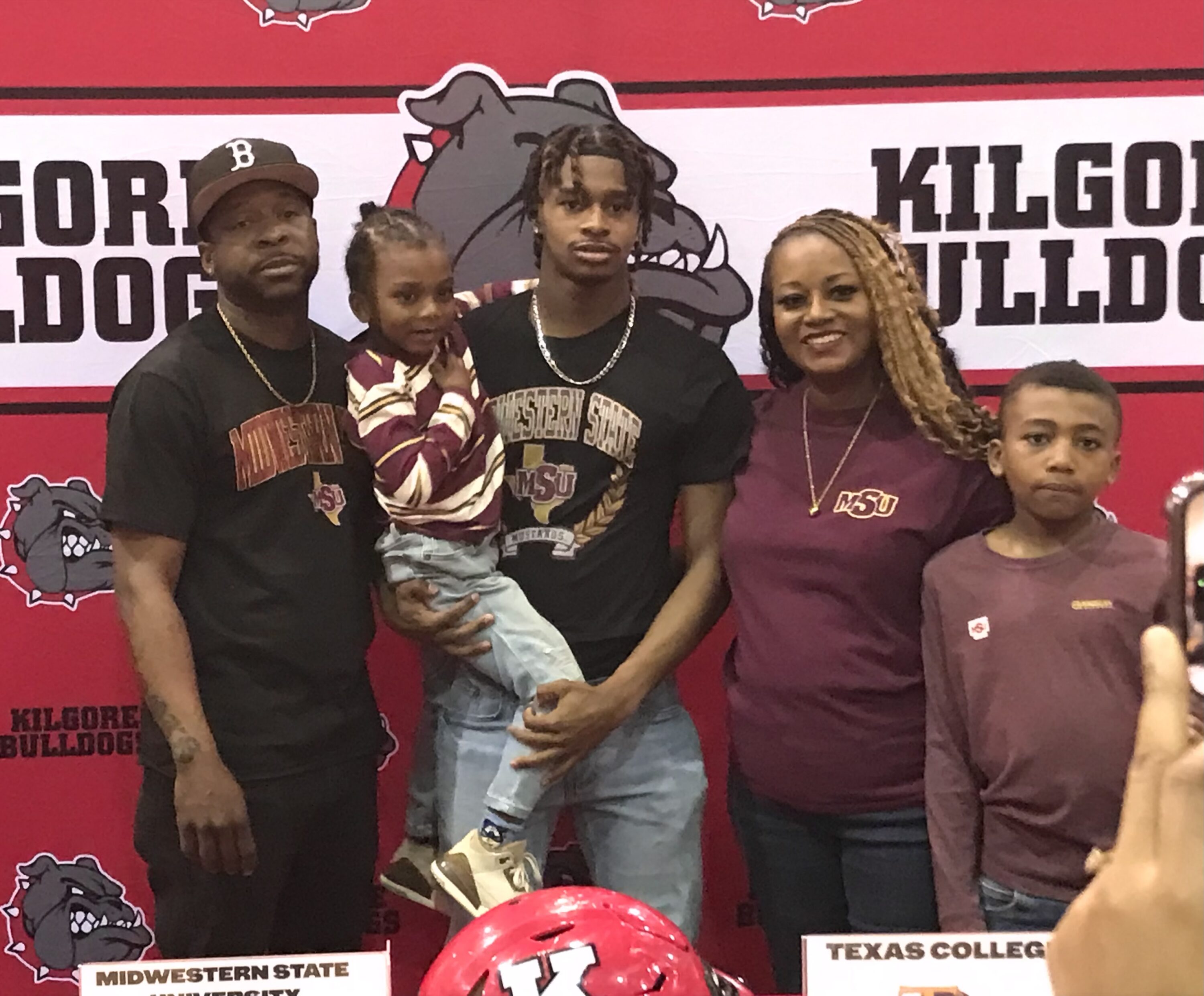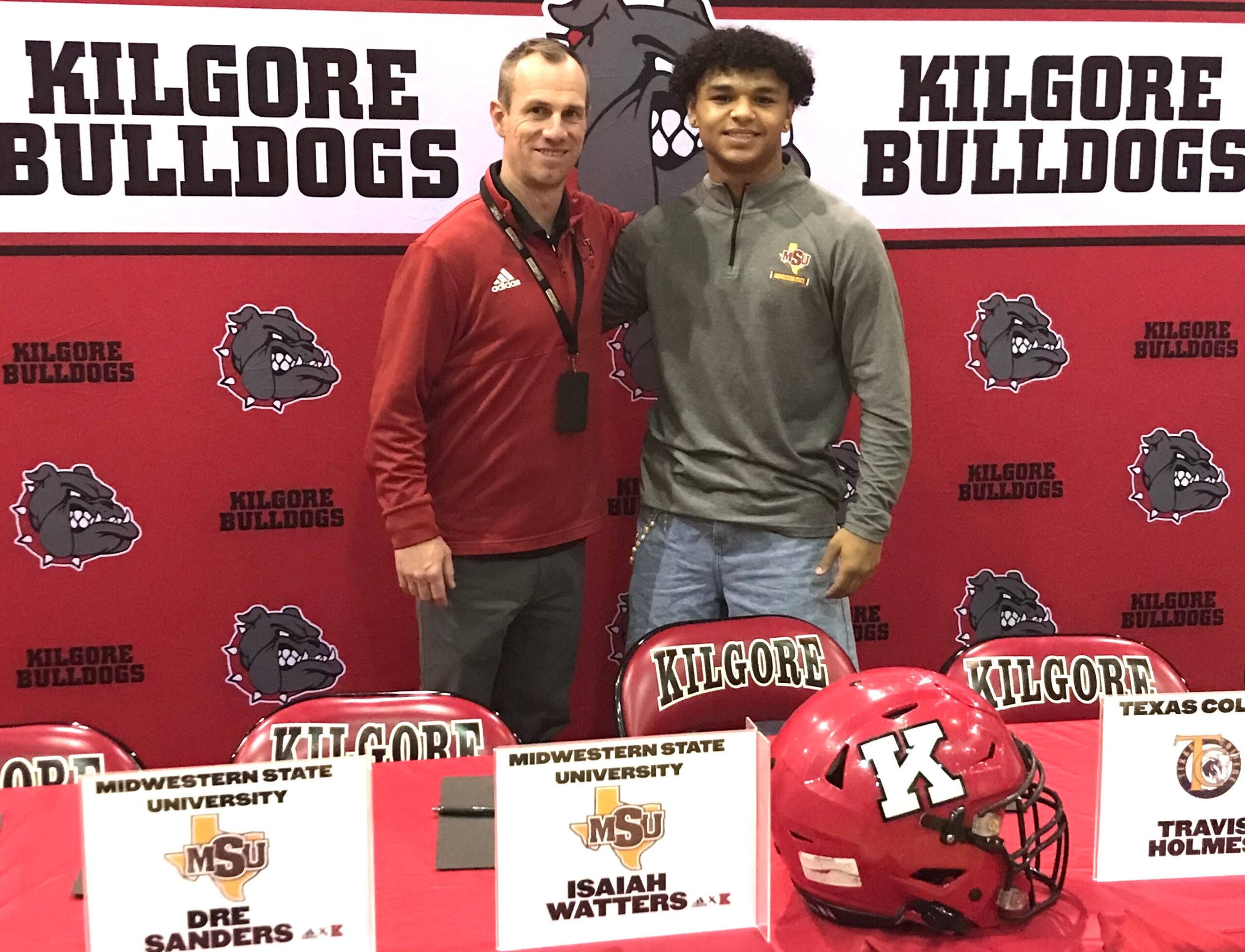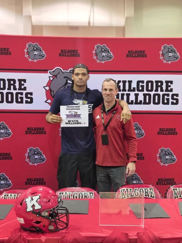 Kilgore High School’s February National Signing Day ceremony was held Wednesday in the school’s gym, with the spotlight on (from left, seated) Bi’Syn Williams, Kayson Brooks, Dre Sanders, Isaiah Watters, Travis Holmes, Hunter Whipkey, Daniel Garcia, and Eddie Jiminez. In the back, standing, are members of Kilgore’s coaching staff. This senior class led Kilgore to back-to-back appearances in the UIL’s Class 4A, Division I state championship game, and in all, in three years on varsity, rolled up an incredible record of 39-7. (Photo by JOE HALE / ETBLITZ.COM)Kilgore defensive back / wide receiver Dre’ Sanders (above) and quarterback Kayson Brooks (below) are both headed to Midwestern State University in Wichita Falls. Sanders is the younger brother of Notre Dame defensive back Jayden Sanders, the son of former KHS athletes Nick Sanders and Whitney Clark. Brooks leaves KHS as the most decorated quarterback in program history. (Photos by JOE HALE / ETBLITZ.COM)Kilgore offensive lineman Daniel Garcia (above) is headed to Texas A&M-Texarkana. (Photo by JOE HALE / ETBLITZ.COM)Bulldogs linebacker Travis Holmes (above) will now be Texas College linebacker Travis Holmes, after signing with TC on Wednesday. (Photo by JOE HALE / ETBLITZ.COM)A&M-Texarkana is also getting big Bi’Syn Williams, who starred at defensive end for coach Clint Fuller (right) and the Ragin’ Red. (Photo by JOE HALE / ETBLITZ.COM)Jack of all trades, master of all of ’em Isaiah Watters (above), who was fantastic for Kilgore at both running back and linebacker the last three seasons, will join teammates Dre’ Sanders and Kayson Brooks at Midwestern State University. (Photo by JOE HALE / ETBLITZ.COM)Kicker Eddie Jiminez (right, with coach Clint Fuller) will stay home and kick for coach Willie Gooden and the Kilgore College Rangers. (Photo by JOE HALE / ETBLITZ.COM)Southeastern Oklahoma State is getting a good one: that would be former Kilgore High School offensive lineman Hunter Whipkey (above). (Photo by JOE HALE / ETBLITZ.COM)