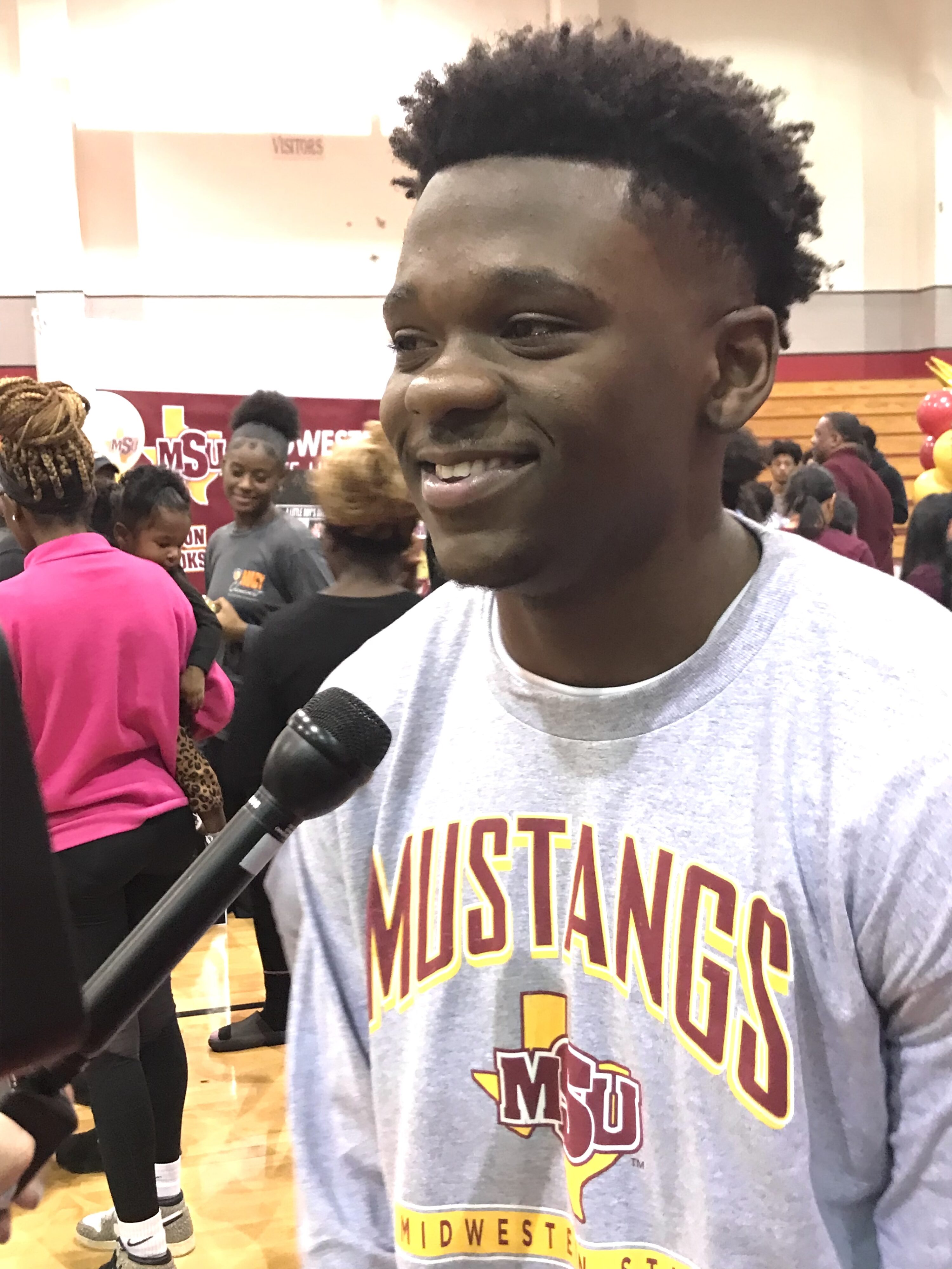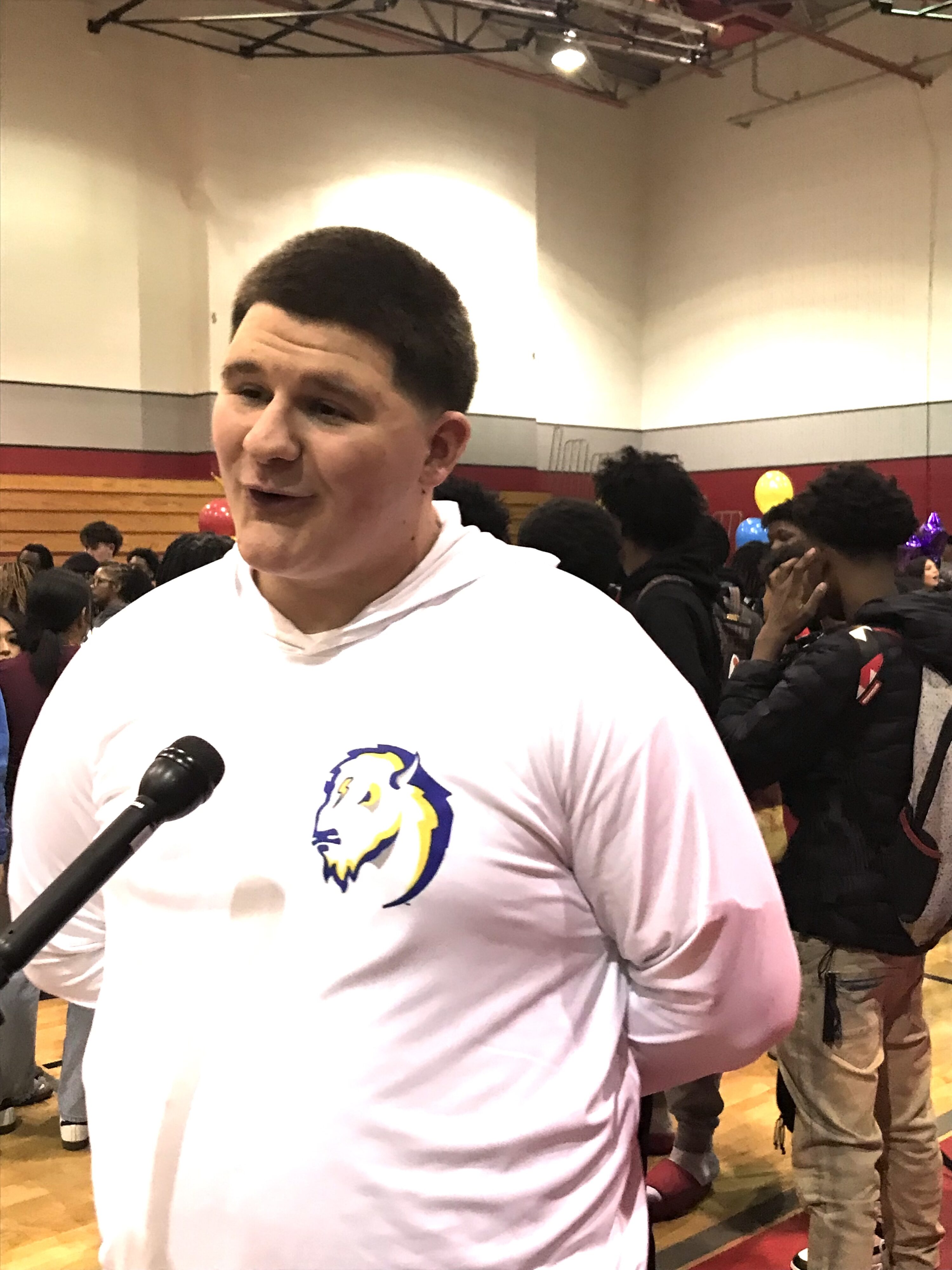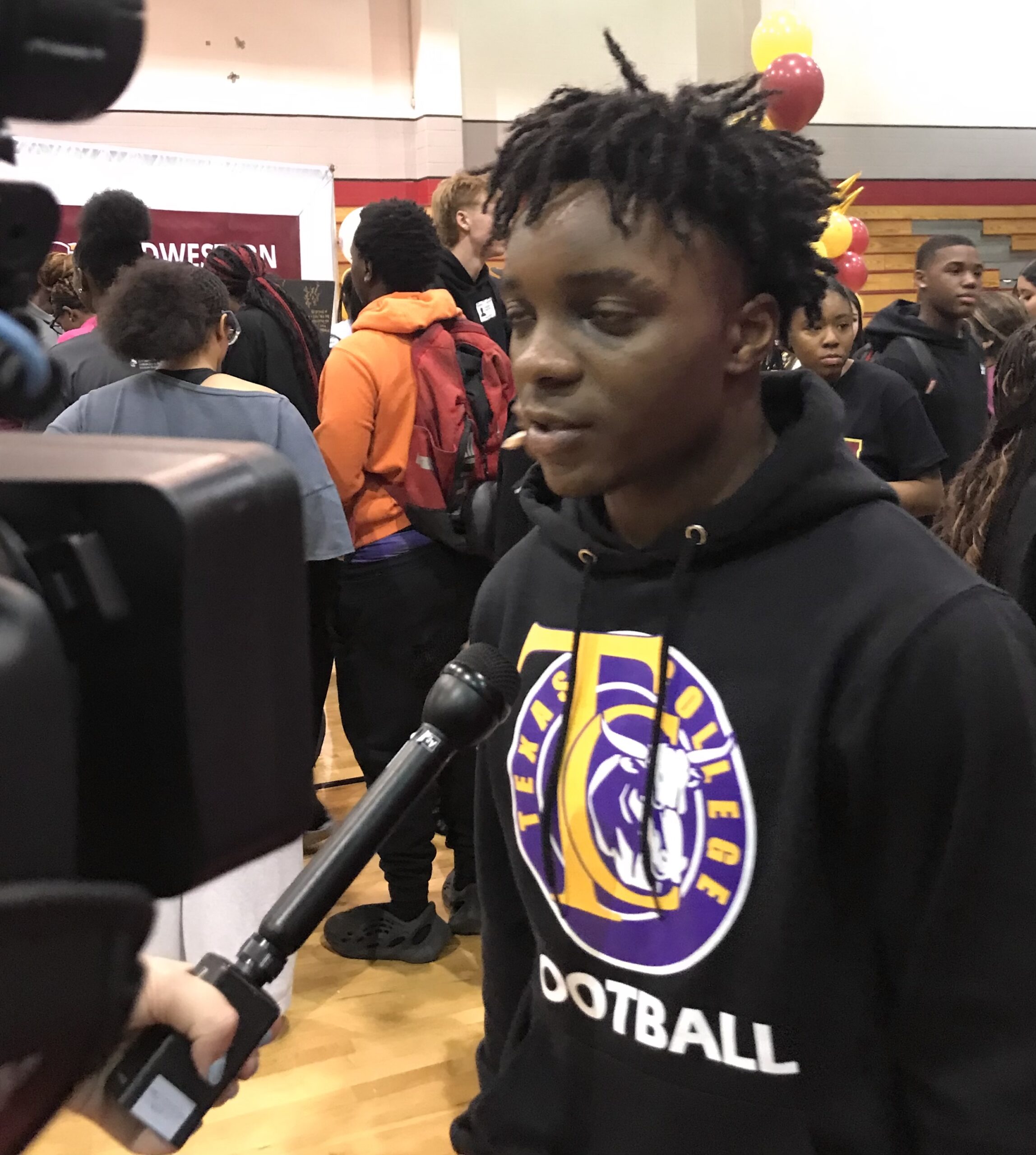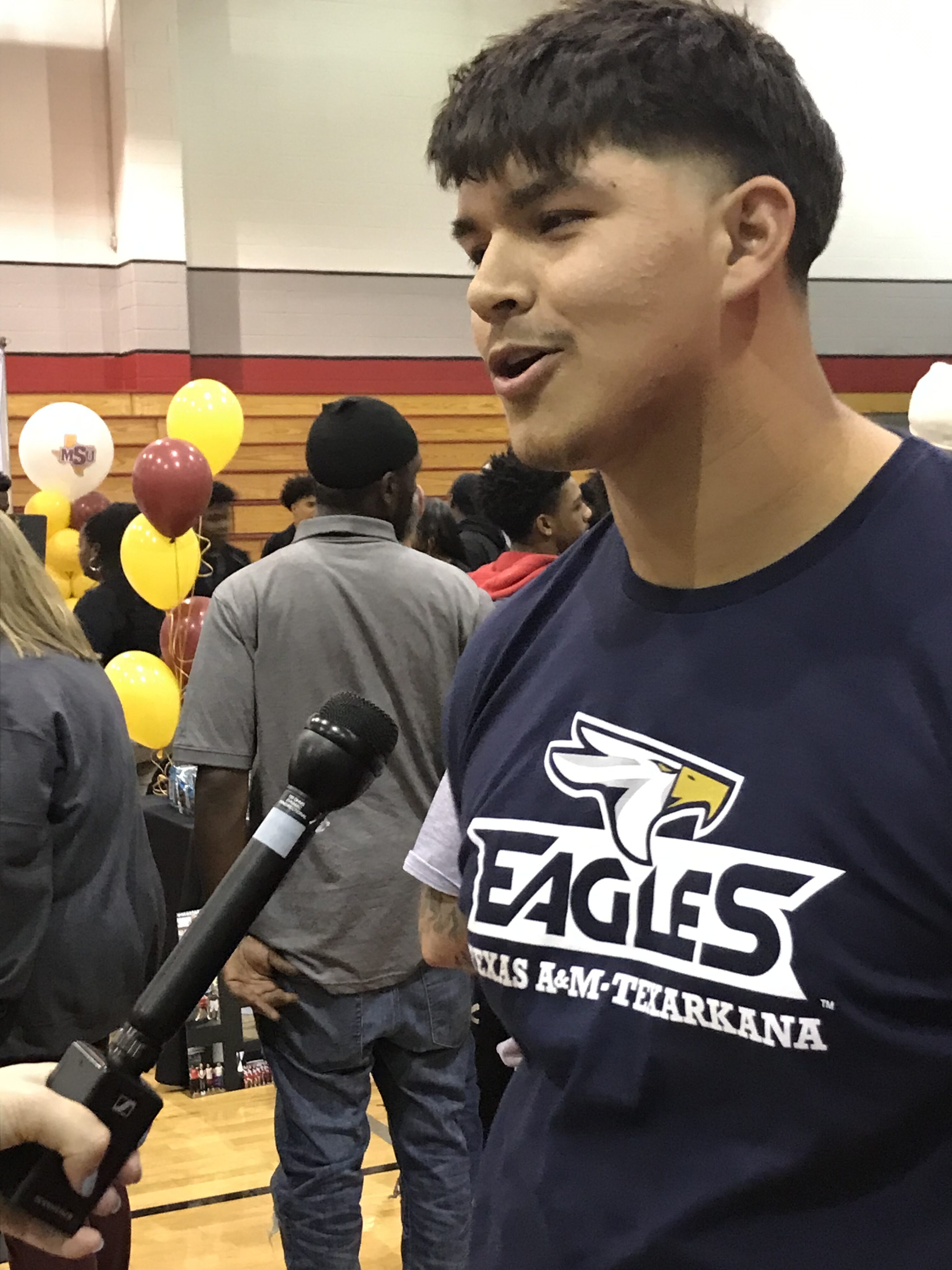 Kilgore High School’s February National Signing Day ceremony was held Wednesday in the school’s gym, with the spotlight on (from left, seated) Bi’Syn Williams, Kayson Brooks, Dre Sanders, Isaiah Watters, Travis Holmes, Hunter Whipkey, Daniel Garcia, and Eddie Jiminez. In the back, standing, are members of Kilgore’s coaching staff. This senior class led Kilgore to back-to-back appearances in the UIL’s Class 4A, Division I state championship game, and in all, in three years on varsity, rolled up an incredible record of 39-7. (Photo by JOE HALE / ETBLITZ.COM)Kilgore defensive back / wide receiver Dre’ Sanders (above) and quarterback Kayson Brooks (below) are both headed to Midwestern State University in Wichita Falls. Sanders is the younger brother of Notre Dame defensive back Jayden Sanders, the son of former KHS athletes Nick Sanders and Whitney Clark. Brooks leaves KHS as the most decorated quarterback in program history. (Photos by JOE HALE / ETBLITZ.COM)Kilgore offensive lineman Daniel Garcia (above) is headed to Texas A&M-Texarkana. (Photo by JOE HALE / ETBLITZ.COM)Bulldogs linebacker Travis Holmes (above) will now be Texas College linebacker Travis Holmes, after signing with TC on Wednesday. (Photo by JOE HALE / ETBLITZ.COM)A&M-Texarkana is also getting big Bi’Syn Williams, who starred at defensive end for coach Clint Fuller (right) and the Ragin’ Red. (Photo by JOE HALE / ETBLITZ.COM)Jack of all trades, master of all of ’em Isaiah Watters (above), who was fantastic for Kilgore at both running back and linebacker the last three seasons, will join teammates Dre’ Sanders and Kayson Brooks at Midwestern State University. (Photo by JOE HALE / ETBLITZ.COM)Kicker Eddie Jiminez (right, with coach Clint Fuller) will stay home and kick for coach Willie Gooden and the Kilgore College Rangers. (Photo by JOE HALE / ETBLITZ.COM)Southeastern Oklahoma State is getting a good one: that would be former Kilgore High School offensive lineman Hunter Whipkey (above). (Photo by JOE HALE / ETBLITZ.COM)