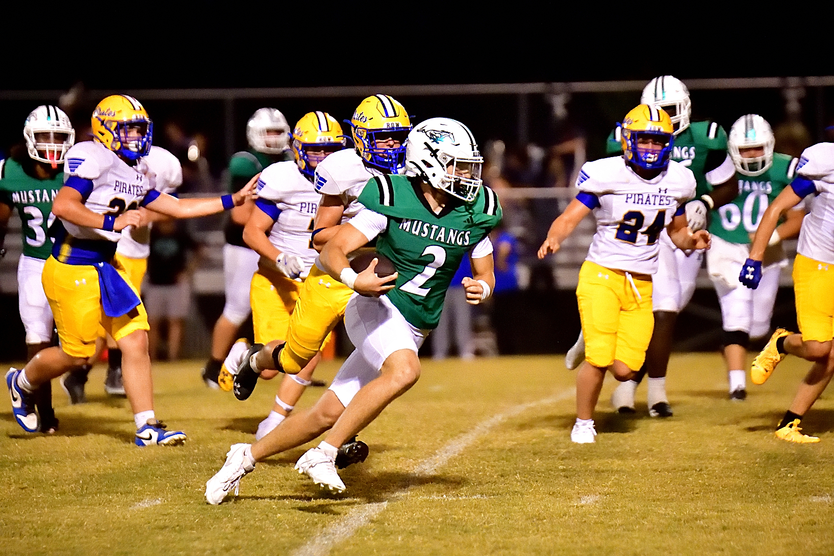 Overton quarterback Rylan Holleman (2) on the move. The Mustangs lost to Carlisle, but that’s been their only misstep so far in 2025. Overton (3-1) hosts district and playoff rival Grapeland (2-2) this Friday night. (Photo by RONNIE SARTORS / SPORT SHOT PHOTOGRAPHY and ETBLITZ.COM)