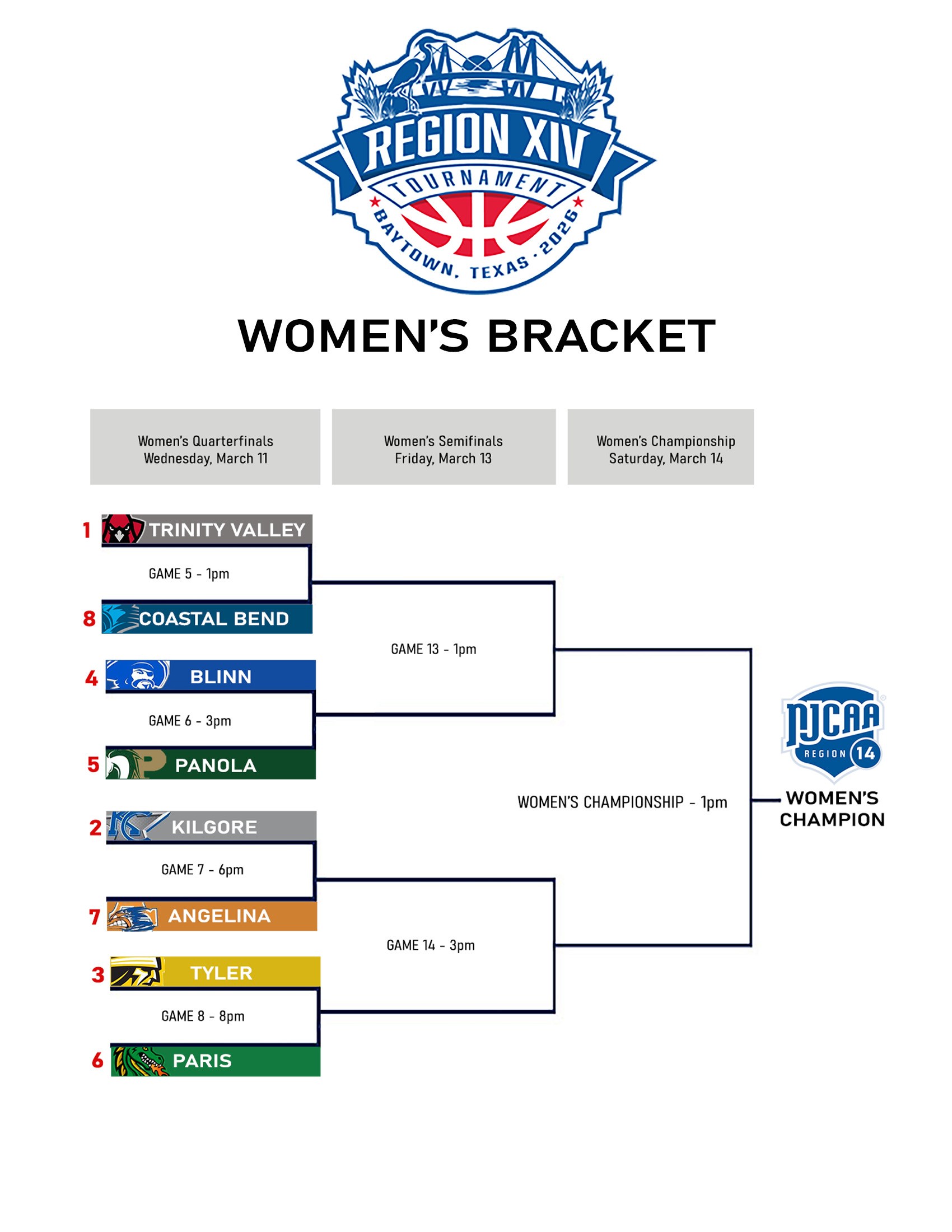 All women’s games can also be seen online, and that’s right here: 2026 Region 14 Women’s Basketball Tournament – TSBN Sports.