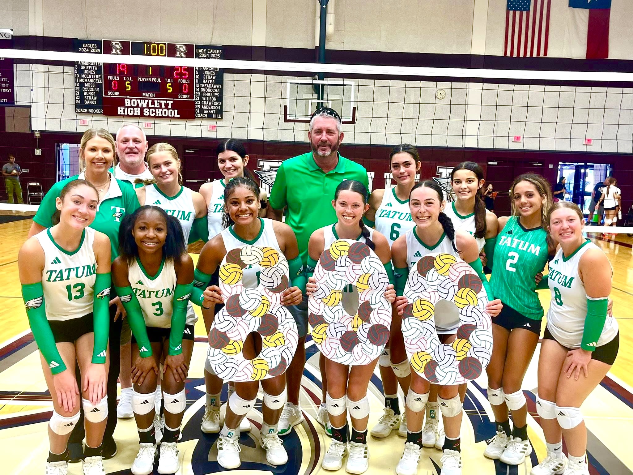 Tatum’s Lady Eagles and coach Leven Barker after coach Barker’s 800th career win. The Lady Eagles are ranked number four, now, in Class 3A. (Photo courtesy of TATUM LADY EAGLES VOLLEYBALL Facebook Page)