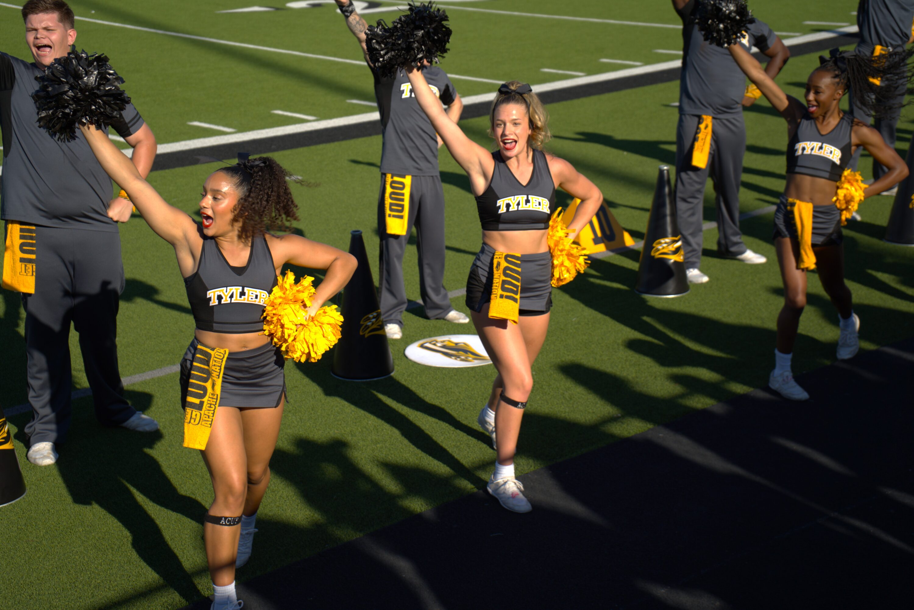 Tyler Junior College cheerleaders are pictured here during the Apaches’ game against Northeastern Oklahoma A&M (NEO). TJC is ranked third in the NJCAA national poll (below) and is one of eight teams in Texas without a loss this season. (Photo by JENNA LUCAS / ETBLITZ.COM)