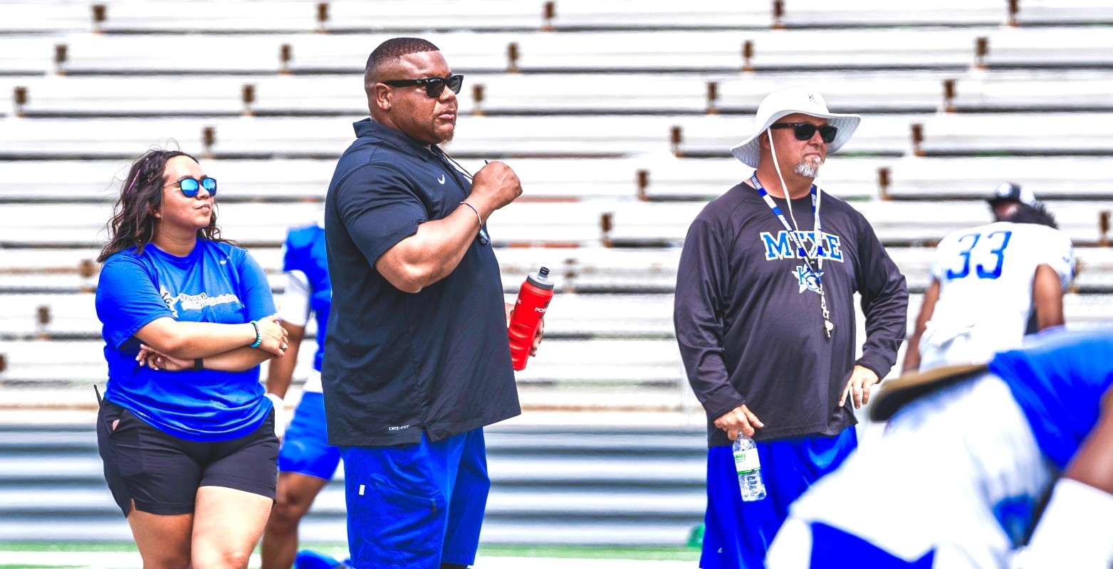 Kilgore College head football coach Willie Gooden (center) and defensive coordinator Russell Thompson (right) look over practice in this ETBlitz.com file photo. The Rangers are 0-3 in the Southwest Junior College Football Conference and have some work to do — but they’re not out of the conference’s playoff race by ANY means.