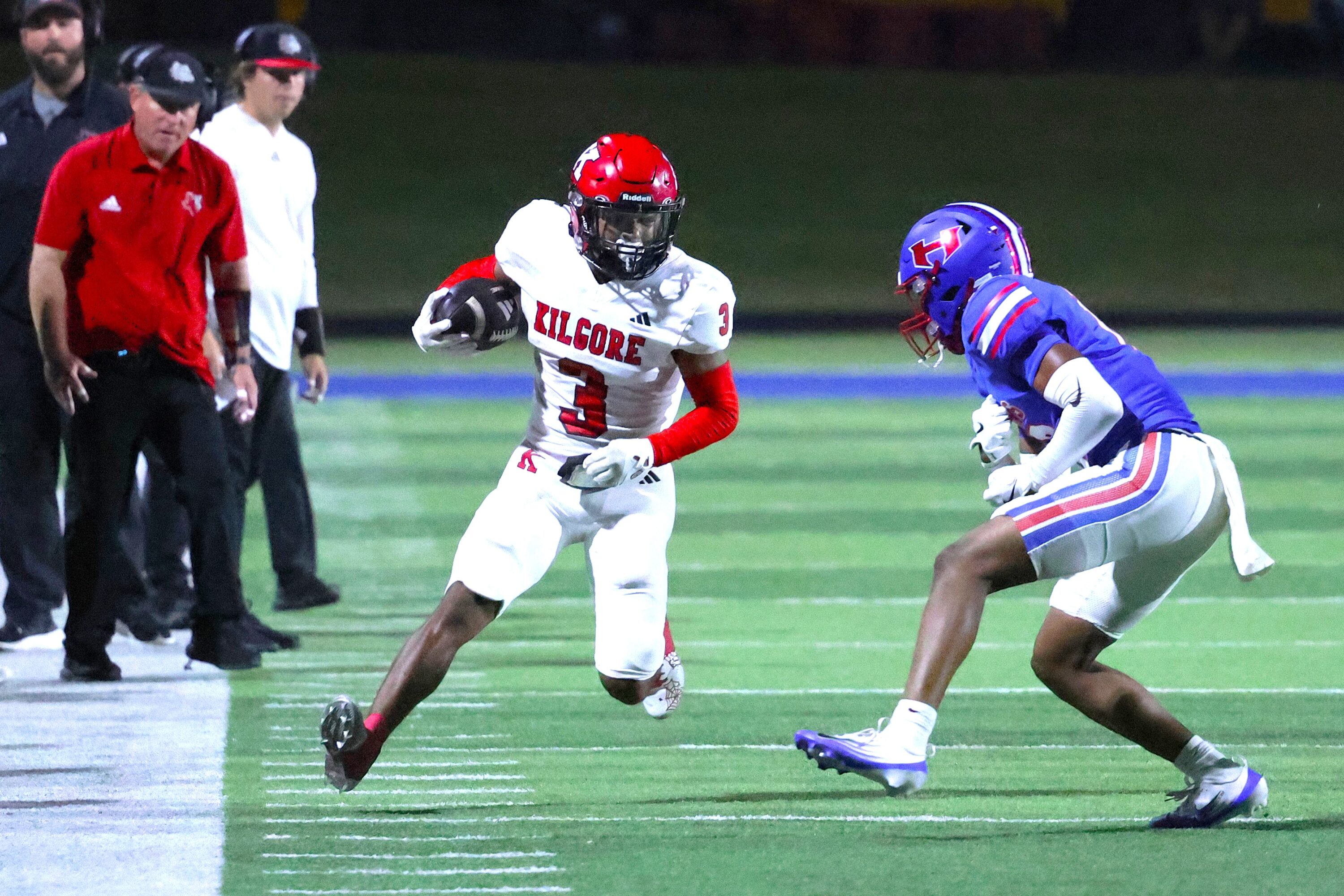 Kilgore’s Dre’ Sanders (3) looks to make a Henderson defender miss during last week’s game between the two at Henderson Lions Stadium. Kilgore (5-1) hosts Chapel Hill (4-2) Friday night at 7:30 p.m. (Photo by DENNIS JACOBS / ETBLITZ.COM)
